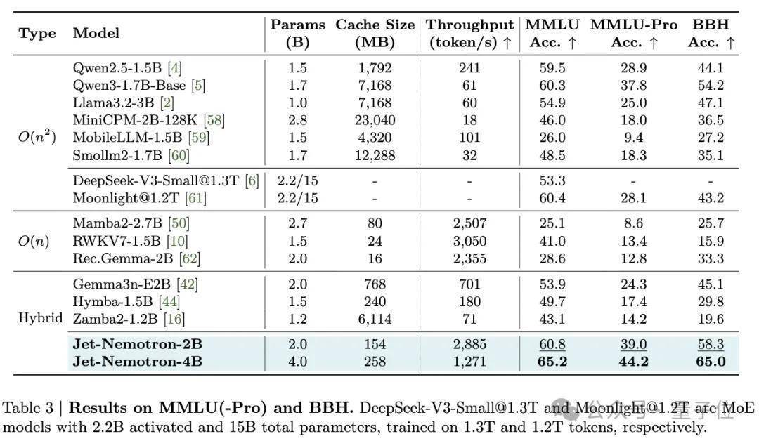 值得一提的是,在MMLU、MMLU-Pro和BBH基准上,Jet-Nemotron-2B相比Qwen3-1.7B-Base吞吐量提高了47倍,缓存大小缩小至1/47。
