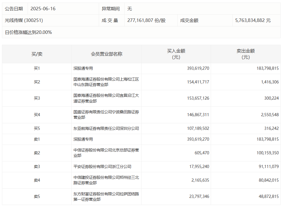 光线传媒今日涨停 深股通专用席位买入3.94亿元并卖出1.84亿元光线传媒今日涨停 深股通专用席位买入3.94亿元并卖出1.84亿元