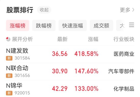 今天,创业板新股N建发致、N联合动及北交所新股N锦华3只新股上市交易,截至收盘分别上涨418.58%、147.6%、133%。